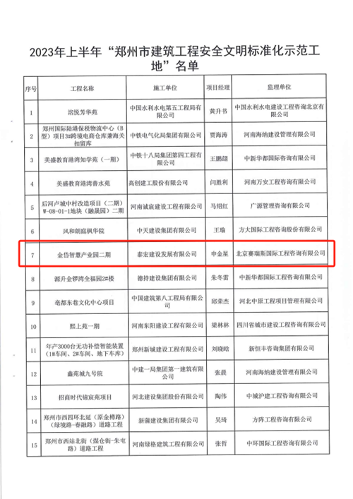 近日,經(jīng)鄭州市城鄉(xiāng)建設(shè)局評選,河南鄭地科創(chuàng)產(chǎn)業(yè)發(fā)展有限公司投資建設(shè)的金岱智慧產(chǎn)業(yè)園二期項目榮獲“2023年上半年鄭州市建筑工程安全文明標準化示范工地”榮譽稱號。