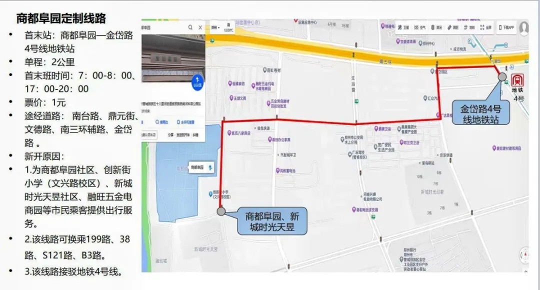 專線開通后,商都阜園項目租戶及業(yè)主實現(xiàn)了“出門即坐上公交,下車即地鐵口”的通勤效率新格局。線路途徑南臺路、鼎元街文德路、南三環(huán)輔路;中途包含超市、理發(fā)店、小商品城等便民商業(yè)點。無論是上班還是購物,都能享受到高效、舒適的出行體驗。線路單程2公里,除直達(dá)地鐵口外也可換乘199路、38路、S121路、B3路。不僅解決了租戶的通勤難題,也為周邊社區(qū)居民提供了便利,得到了大家的一致好評。