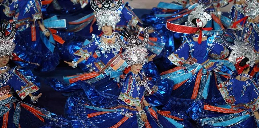 各民族運動員身著民族盛裝,精神抖擻,闊步走來。各代表團行進中30秒的駐停表演,展示了中華文化百花園的絢麗多姿,讓現(xiàn)場觀眾贊嘆沉醉。