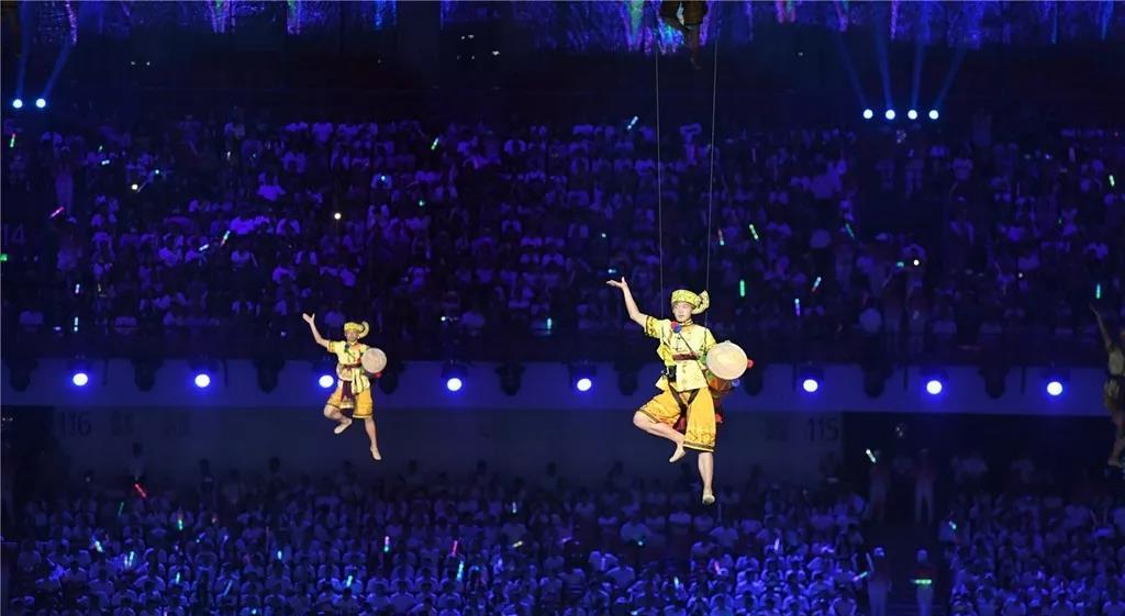 當現(xiàn)場屏幕通過虛擬技術(shù)應用,呈現(xiàn)出美麗的畫面,讓現(xiàn)場觀眾仿佛置身北國北川、南嶺飛瀑之中,觀眾都情不自禁地揮舞起了手中的國旗為他們的表演喝彩!為我們偉大的祖國喝彩!1000架無人機從奧體中心廣場升起迅速變換成中中的造型,點燃民族運動會的火炬。