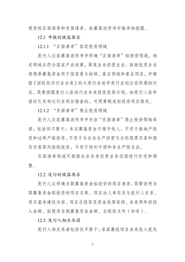 (二)申報(bào)材料應(yīng)明確債券募集資金禁止投向領(lǐng)域,形成“負(fù)面清單”。“負(fù)面清單”包括但不限于:將募集資金借予他人,用于房地產(chǎn)投資和過(guò)剩產(chǎn)能投資,用于與企業(yè)生產(chǎn)經(jīng)營(yíng)無(wú)關(guān)的股票買(mǎi)賣(mài)和期貨交易等風(fēng)險(xiǎn)性投資,用于彌補(bǔ)虧損和非生產(chǎn)性支出。“負(fù)面清單”領(lǐng)域可根據(jù)企業(yè)自身經(jīng)營(yíng)業(yè)務(wù)范圍進(jìn)行補(bǔ)充和調(diào)整。
